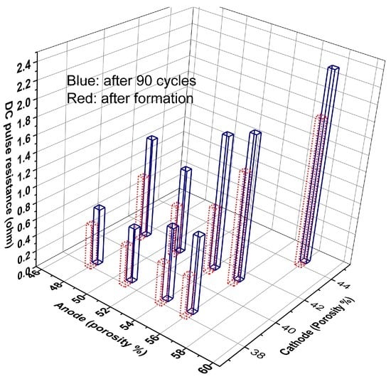 All voltage transients in Figure 2 are of similar shape and aligned in parallel. They differ only by the initial voltage offset at the beginning of the discharge pulse. This means that the cells vary primarily by internal ohmic resistances, whereas the mass transport of lithium ions in the liquid phase influenced by the pore structure does not have an effect (at C/2 and 20-s pulse duration). Given the dependency on calendering force, we believe that these cells are limited by the particle to particle contact resistance for electron transport. The column plot of Figure 3 gives a clearer view of the relation of anode and cathode porosities on the DC pulse resistance. Right after the formation and at the beginning of life, Cells F, G, H and I have the same DC resistances, which are governed by cathode porosity, but not anode porosity. After 90 cycles, Cells H and I show the smallest increase of DC resistance by 29%, whereas the resistances of the other calendered cells increased by 29%–82%.