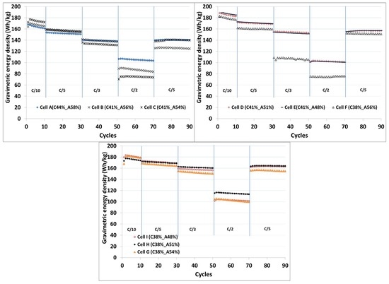 Comparison of the gravimetric energy density (Wh/kg) values obtained from the graphite-NMC-based full cells at different C-rates.