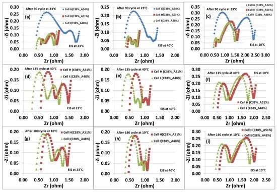An increase in the size of high frequency semicircles was seen when the cells Cell H (C38%-A51%) and Cell I (C38%-A48%) were cycled for the next 45 cycles at 40 C, while no significant change was observed when the cells were cycled for the next 45 cycles at 10 C, indicating that a stable solid-electrolyte interphase (SEI) has formed on the graphite particles. The sizes of the medium frequency semicircles are changing gradually upon cycling.