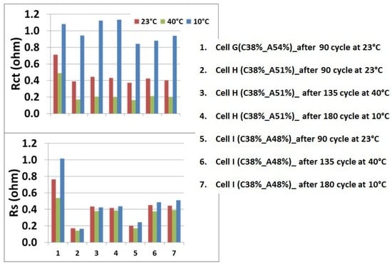 A gradual increase in the charge transfer resistance was observed while the surface resistance gets almost saturated upon cycling. The is reduced at 40 C, while it increases considerably at 10 C, which is due to the change in the ionic conductivity of the electrolyte at elevated temperatures. As temperature increases, the decreases, which is related to the Butler–Volmer kinetic equation for the activation-controlled charge transfer electrochemical reaction [12]. Among all combinations of porosities, Cell I (C38%-A48%) exhibits the smallest charge transfer resistance.