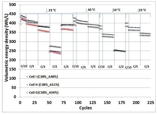 The comparison of the volumetric energy density (Wh/L) values obtained from the full cells, containing NMC cathodes with 38% porosity and graphite anodes with 48%, 51% and 54% porosities, at different C-rates at temperatures of 23 C, 40 C and 10 C is displayed in Figure 7. The same full cells were cycled at different temperatures. A simple calculation was done taking the anode, cathode, separator and half of the substrate foils thicknesses into account to calculate the volume of the electrode stack and its volumetric energy density in Wh/L. The pouch foil and current tabs are not included in the calculation.