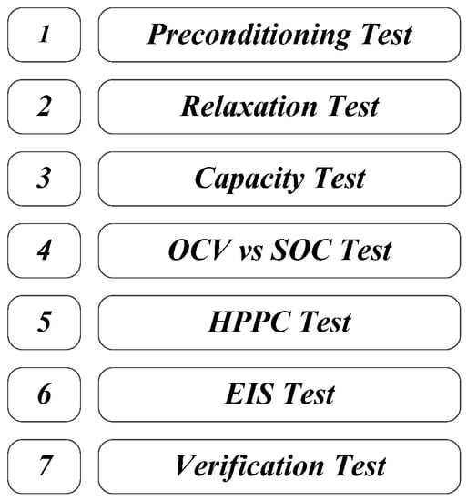 In order to determine the performance behavior of the tested LFP/C battery, the seven-step methodology, which is presented in Figure 2, was proposed. This methodology is composed of various tests, which were carried out following the sequence illustrated in Figure 2; the first six tests are presented throughout the next subsections, while the last step (i.e., verification test) is extensively discussed in Section 5.