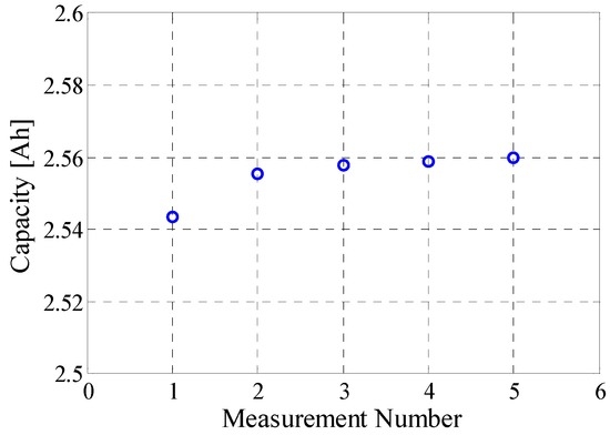 The measured capacity of the LFP/C battery was stable, with a tendency of slight monotonic increase of approximately 0.6% during the five performed cycles; nevertheless, the battery was considered preconditioned since its capacity did not change more than 3% during two consecutive discharges [34].