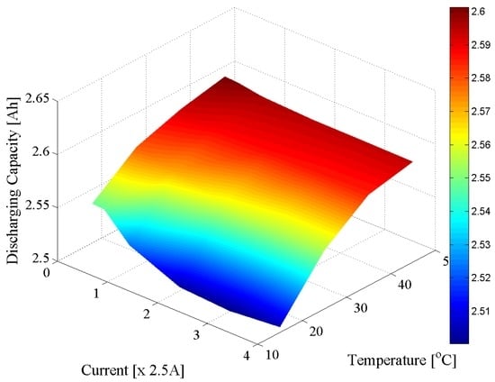 The capacity of Li-ion batteries is dependent on the operating temperature and on the applied load current [15,17]. Moreover, as presented by various researchers, the capacity of Li-ion batteries degrades over time [36,37,38]; however, this analysis is out of the scope of the present paper. The objective of the capacity test was to determine the dependence of the charged and discharged capacity of the LFP/C battery on the two aforementioned parameters. Thus, the capacity of the battery was measured for six different C-rates (i.e., C/4, C/2, 1C, 2C, 3C and 4C) and at four different temperatures (i.e., 15 °C, 25 °C, 35 °C and 45 °C), following the procedure which is presented in [21].