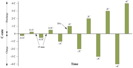 The impedance represents a very important performance parameter of the Li-ion batteries since it defines the power capability of the battery. Moreover, it is the parameter which describes the dynamic behavior of Li-ion batteries. As most of the Li-ion battery parameters, the impedance shows a non-linear behavior depending on the operating conditions such as SOC, temperature, C-rate [44,45]. Furthermore, the battery impedance is highly dependent on the battery’s state-of-health (SOH) [44]; however, this is out of the scope of the present work. In order to account for all the aforementioned dependences, the impedance of the LFP/C battery was measured following a modified version of the hybrid pulse power characterization (HPPC) test. The measurement profile applied to the LFP/C battery is presented in Figure 6 and consists of consecutive charging and discharging DC current pulses of different C-rates (i.e., 0.1C, 0.5C, 1C, 2C, 3C and 4C); the pulse duration was set to 18 s [34] and the relaxation time between each two consecutive pulses was set to 15 min.