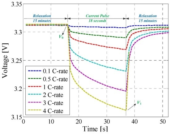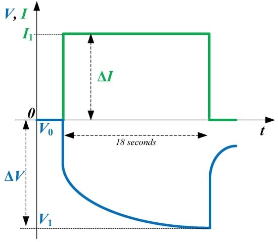 The typical voltage response of a Li-ion battery to a discharging current pulse is illustrated in Figure 7; a similar voltage behavior is obtained for a charging current pulse. As presented in the ISO 12405-1:2011 Standard [34], the charging and discharging impedance of the battery could be calculated for various pulse lengths (i.e., 0.1 s, 2 s and 18 s). Furthermore, the impedances corresponding to these pulse lengths are caused by/related to different electrochemical processes inside the battery [44]. Nevertheless, in this work, impedance values determined for a current length of 18 s are presented. Based on the current and voltage measurements, the impedance of the Li-ion battery is computed based on Ohm’s law, as: