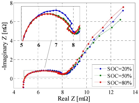 In this work, the EIS measurements were performed in galvanostatic mode and for the frequency range 10 kHz–10 mHz. Furthermore, all the EIS measurements were performed without superimposed DC current; thus, the influence of the current on the small-signal AC impedance was not determined. As for the other considered performance parameters, the small-signal impedance was measured at different temperatures and for the entire SOC interval (0%–100% SOC with 5% SOC resolution). The dependence of the LFP/C battery’s impedance spectra on the SOC and temperature is presented in Figure 10 and Figure 11, respectively.