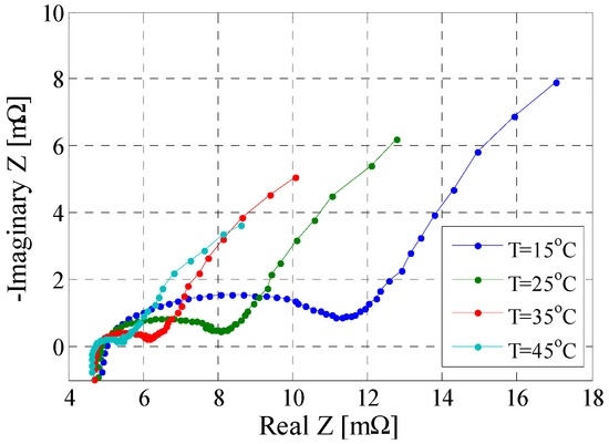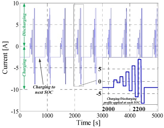 Furthermore, in order to consider the dependence of the impedance on SOC and temperature, the test profile presented in Figure 6 was applied to the 5%–95% SOC interval (considering a 5% SOC resolution) and for the same temperatures (i.e., 15 °C, 25 °C, 35 °C and 45 °C) considered during measurement of the other performance parameters.