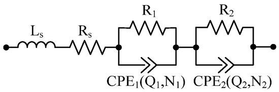 As presented in Figure 14, the EEC configuration based on a series inductance Ls, a series resistance Rs, and two ZARC elements (i.e., parallel connections of a resistor and a constant phase element) was able to accurately fit the measured impedance spectrum of the tested LFP/C battery. Therefore, this EEC configuration was used to fit all the measured impedance spectra (at the conditions discussed in Section 3.6) and thus to model the performance behavior of the LFP/C battery. The impedance of the selected EEC is given by: