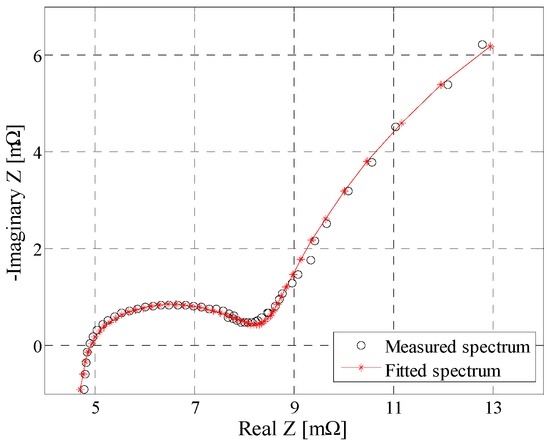 The parameterization of the EEC was realized by curve fitting the impedance spectra of the LFP/C battery, which were measured at different conditions as presented in Section 3.6. The configuration of the EEC which was used for curve fitting, and consequently to express the dynamics of the LFP/C battery, is illustrated in Figure 13. The curve fitting procedure was based on a complex non-linear least-square (CNLS) algorithm, where both real and imaginary components of the measured impedance were fitted simultaneously using a least square minimization; an example of the impedance spectrum curve fitting results is shown in Figure 14.