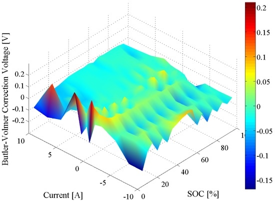 Theoretically, the exponential dependence between the Li-ion battery current and the potential can be determined from the Butler-Volmer equation given in Equation (7) [47].