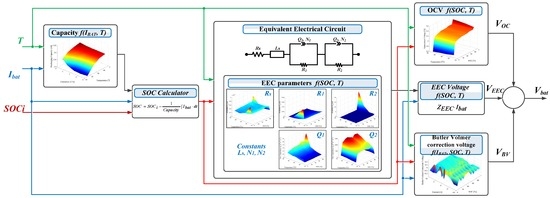 Based on the voltage Equation (6) and considering the dependences of the performance parameters on the operating conditions, the performance model of the LFP/C battery was implemented according to the block diagram proposed in Figure 18.