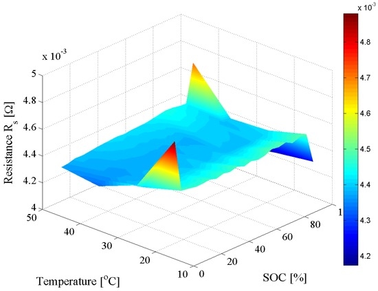 During the fitting process of the measured impedance spectra, it was found out that only Rs, R1, R2, Q1, and Q2 are dependent on the SOC and temperature at which the EIS measurements had been performed. Consequently, these parameters were implemented into the performance model as 2D look-up tables since their values are dependent on the SOC and temperature; Figure 19 exemplifies the look-up table implementation of the series resistance Rs. The other parameters of the EEC, Ls, N1, and N2 were found to be constant, independent of the operating conditions: Ls = 1.8 × 10−8 H, N1 = 0.5, and N2 = 0.8.