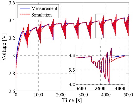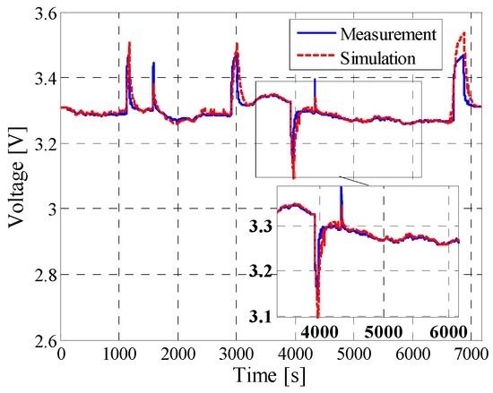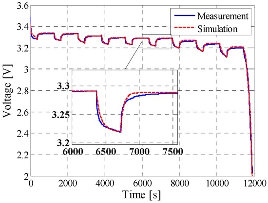 In order to verify the accuracy of the developed performance model of the LFP/C battery and to validate the proposed characterization procedure, different load current profiles were considered. The accuracy of the developed performance model was evaluated by computing the coefficient of determination R2 which was obtained by comparing the measured and estimated battery’s voltage profiles, according to Equation (8).