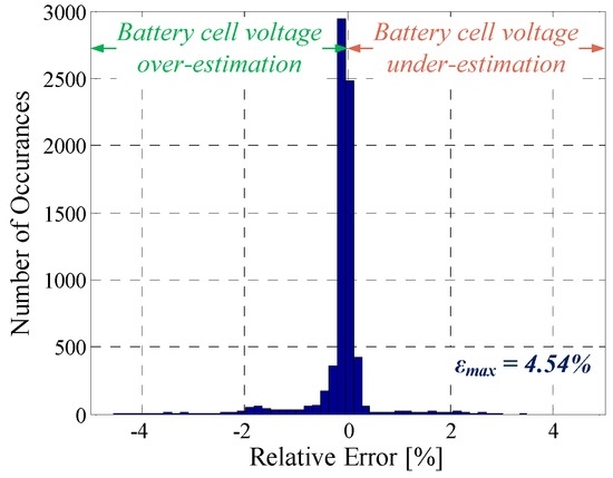 The distribution of the voltage deviations, expressed as relative error values, is presented in Figure 21, showing that the model has a slight tendency of over-estimating the voltage behavior of the tested LFP/C battery; the main contribution of this tendency is represented by the voltage estimation error after the current pulse is cut off. The dynamic behavior of the performance model might be improved (thus the accuracy of the model will further increase) by considering an EEC with more ZARC elements (or R-C parallel networks) [24]; however, this will cause a high increase of the computation time of the performance model.