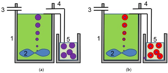 Schematic diagram of (a) a continuous stirring tank reactor (CSTR) used to co-precipitate hydroxides of metals with similar solubilities, such as Co, Ni, and Zn, and a consistent composition throughout the spherical particles; and (b) a CSTR to incorporate larger atoms, such as Al and Y, which have lower precipitation rates at initial nucleation stage (purple core) and higher precipitation rates at the growth stage (red shell). 1: stainless-steel vessel; 2: mixer blade; 3: raw material inlet; 4: product overflow; and 5: product container.