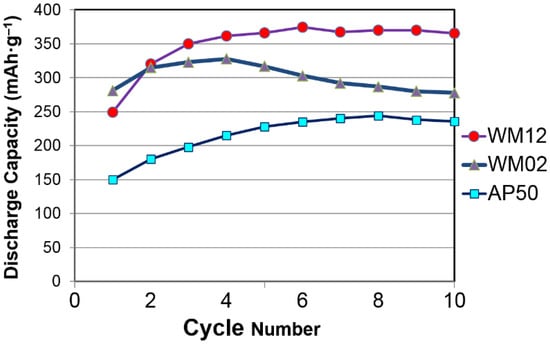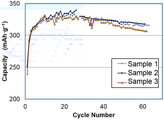 Two different conditions (Ni-1 and Ni-2) were employed in the batch process [15]. While Ni-1 has a composition that incorporates pure Ni as the cation source, which exhibits an exclusively β-Ni(OH)2 structure, Ni-2 is doped with 14 at % Al and show a typical α-Ni(OH)2 structure. The discharge capacities for the three samples from the Ni-2 process are shown in Figure 3. It took approximately 15 cycles to stabilize the capacity. The highest discharge capacity obtained with a 25 mA·g−1 rate was 346 mAh·g−1 at the 25th cycle.