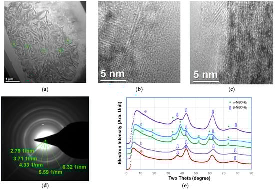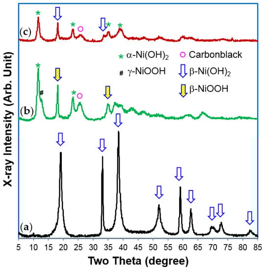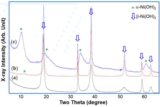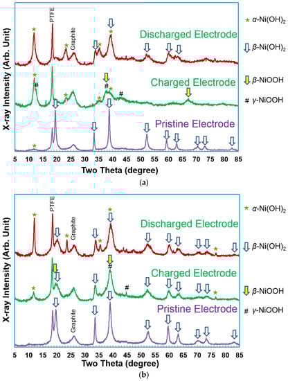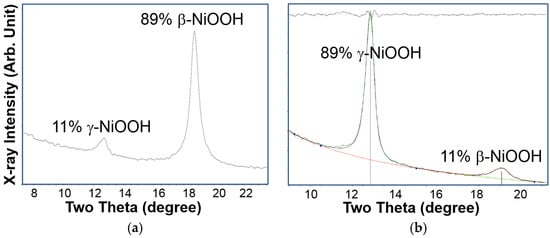XRD analysis results indicate a β-Ni(OH)2 structure for the material before cycling, which turned into an α-Ni(OH)2–predominant structure after cycling (Figure 5). The different peak widths of the XRD patterns (especially in Figure 5a) are the products of preferential growth of Ni(OH)2 flakes on the ab-plane and various stacking faults [79]. The product may be further improved (especially the cycle stability) for battery applications, but the process itself is complicated and currently limited to a laboratory scale. Mass production of the batch process will not be cost-effective.