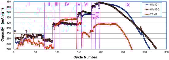 In another comparison test, three samples (two WM12 and one control β-Ni(OH)2) (YRM3: Ni0.93Co0.02Al0.05(OH)2) underwent nine different charge/discharge conditions (Table 4) and the obtained capacities are plotted in Figure 11. While the increases in charge current density from 50 to 75 and 125 mA·g‒1 in stages III and IV boosted capacities for both WM12 and β-Ni(OH)2, further increase in the charge current density (stage V) improved the capacity of WM12, but not β-Ni(OH)2. It seems that WM12 benefits, but β-Ni(OH)2 deteriorates with faster charge. From this comparison, the superiorities in the discharge capacity and cycle stability of WM12, compared to the regular material, are validated. The final failure mechanisms for both materials (WM12 and the β-Ni(OH)2) are the same: electrode disintegration due to particle pulverization.