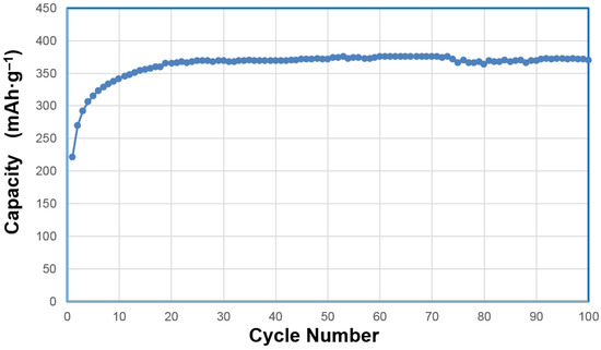 Half-cell capacity measurement of α/β Ni(OH)2 WM12 prepared by the CSTR process with charge and discharge currents at 100 mA·g‒1 (charge for 5.5 h). Capacity calculations are based on the weight of active material. The highest capacity of 376 mAh·g‒1 was obtained at the 61th cycle and the capacity at 100th cycle is 371 mAh·g‒1.