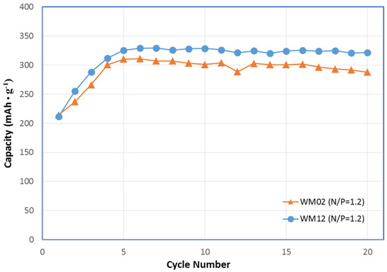 In a separate cycle life experiment, we performed a 100 mA·g‒1 rate charge for 5.5 h and discharged at the same rate. Results are shown in Figure 12. The highest capacity of 376 mAh·g‒1 was obtained during the 61th cycle and the capacity at the 100th cycle was 371 mAh·g‒1. With the success in the half-cell experiment (with 50% additional binder and electrical conduction enhancer), we began the full-cell measurement of WM12 and WM12 in the newly developed pouch-type Ni/MH battery [15]. Only 10% binder and electrical conduction enhancer were added in the positive electrode and the capacity results, based on the total material weight (active plus additives), are plotted in Figure 13. Discharge capacities of 329 mAh·g‒1 and 311 mAh·g‒1 were obtained for the positive electrodes of the WM12 and WM02 full cells, respectively. From this point, further tests on the full cells are planned and more results will be reported in the future, especially for the phase stability under storage condition since α-Ni(OH)2 is known to have an aging issue when stored in an alkaline solution [30]. It is obvious that the same WM12 material required less activation cycles and achieved a lower capacity in the sealed-cell configuration than that in the half-cell (6 versus 20). This is due to the reliance of the β–NiOOH to γ–NiOOH transition on the amount of over-charge. In the half-cell operated in the open atmosphere, the over-charging process has to compete with oxygen gas evolution and thus is less effective, compared to reactions operated in the sealed-cell configuration (more activation cycle is needed). The difference in the maximum capacities between two measurements is related to the expansion of unit cell that occurs in the β–NiOOH to γ–NiOOH transition. In the half-cell testing, the electrode was allowed to expand and, therefore, more NiOOH was converted, which differs from the limited space available in the sealed-cell.