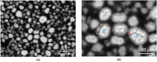 The microstructure of WM12 was studied by both SEM and TEM. Cross-section SEM backscattering electron images of activated WM12 at different magnifications are shown in Figure 14. Different contrasts can be observed in the shell (A, darker) and core (B, lighter). EDS analysis results show that the surface region has a higher Al-content (ca. 4 at %) than the core region (ca. 1.5 at %) [15]. The core–shell structure was produced in the CSTR with a differential precipitation of Al in the tank (Figure 2b). In the nucleation stage, near the bottom of the tank, less Al becomes crystallite due to its relatively large size and, thus, an Al-lean core forms. As the particles are moved into the upper portion of the reactor by the stirring blade, they grow in size with a higher Al-content in the shell part of the particle. Materials produced at this stage are still β-Ni(OH)2. Later, during electrochemical formation, the shell, with a relatively higher Al-content, develops a β-Ni(OH)2 structure.
