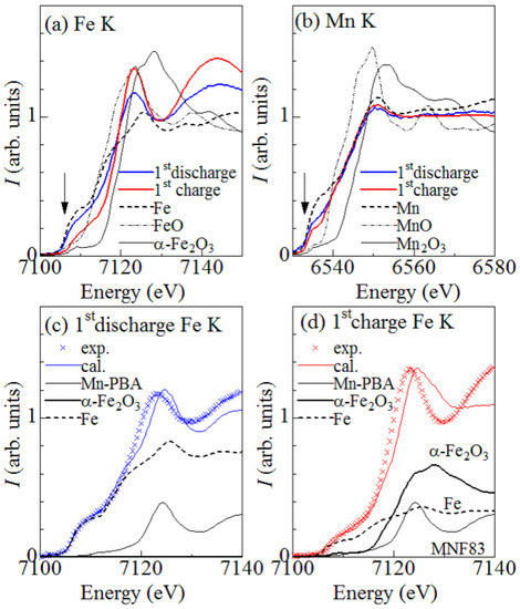 Figure 3a shows X-ray absorption spectra of the discharged and charged films around the Fe K edges. The absorption edge of the charged film is the same as that of Fe metal (downward arrow), suggesting that Fe is reduced to metal after the discharge process. The spectral weight around the absorption edge significantly decreases in the charged film, suggesting that the Fe metal is oxidized in the charge process. However, the overall spectral profile of the discharged and charged films seriously differs from that of Fe metal. In particular, peak structures are observed at 7122 eV in both the films, suggesting residual [Fe(CN)] species [24,25]. We decomposed the Fe K edge spectra of the 1st discharge (Figure 3c) and 1st charge (Figure 3d) films into the spectra of the as-grown film, -FeO and Fe metal. The decomposition suggests that the discharge film consists of 80% Fe metal and 20% [Fe(CN)], while the charge film does 35% Fe metal, 45% -FeO, and 20% [Fe(CN)]. Thus, the XAS data clearly demonstrates that Fe metal is converted into -FeO after the charge process. We note that the residual [Fe(CN)] cannot contribute the redox reaction ([Fe(CN)]/[Fe(CN)]) in the charge/discharge process because the corresponding redox potential (≈3.5 V versus Li/Li) is above the upper cut-off voltage (=3.0 V).
