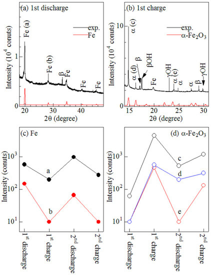 Figure 4c shows cycle dependence of the intensities of the Fe peaks. The intensities decrease after the 1st charge process, increase after the 2nd discharge process, and then increase after the 2nd charge process. Figure 4d shows cycle dependence of the intensities of the -FeO peaks. The intensities increase after the charge process and decrease after the discharge process. These cycle dependences clearly demonstrate reversible conversion reaction between Fe metal and -FeO.