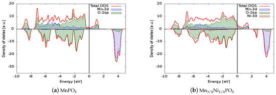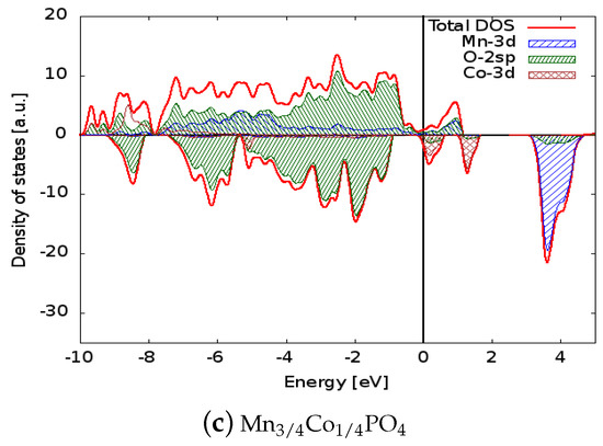 The lithium insertion potentials and band gaps are reported in Table 2: the DFT+U model predicts a band gap for LiMnPO and an insertion potential for the process MnPO + Li + e→ LiMnPO in accordance with the experimental data. Moreover, the doped structures—even if remaining wide band gap semiconductors—show a reduced band gap with respect to LiMnPO. In addition, for the doped systems, the calculations predict a larger lithium insertion potential with respect to LiMnPO. Since the predicted values are below 5 V and still compatible with existing electrolytes, this could enable the production of batteries with enhanced energy density. Kwon and Fromm [53] reported a capacity of 165 mAh/g (about 1.1 mAh/mol) for LiMnPO and an electrochemical window between 4.1 and 2.5 V: if we suppose that the doping does not change the molar capacity and the minimum operating voltage of the material too much, the increase in the maximum potential implies an improvement of the energy storage density (15% and 11% for Ni and Co doping, respectively).