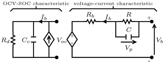 Similar to other types of batteries, the lithium-ion battery has four main components: positive and negative electrodes, electrolyte, and a separator. Its electric circuit model is shown in Figure 1. The voltage–current characteristic is modeled by an resistance-capacitance () network, with  being the internal battery’s resistance. On the other side, the – characteristic is represented by a self-discharging resistance, a battery storage capacitor, and a current-controlled current source. To bridge these two networks, a voltage-controlled voltage source is used [].