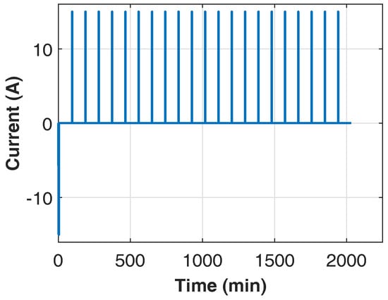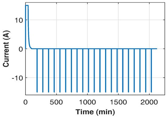To evaluate the performance of the proposed techniques, a 15 Ah lithium-ion battery was subjected to predefined charge/discharge current profiles at various temperatures (0 C, 10 C, 25 C, and 40 C). For each charge/discharge cycle, the battery’s terminal voltage and current were measured as is illustrated in Figure 2. The collected experimental data at different temperatures was used with a sampling time of 1 s to validate the effectiveness of the adaptive filters. The estimated voltage of each technique is compared against the measured terminal voltage. For a better comparison, the relative  estimation error of between both  and  algorithms is calculated with the following relation: