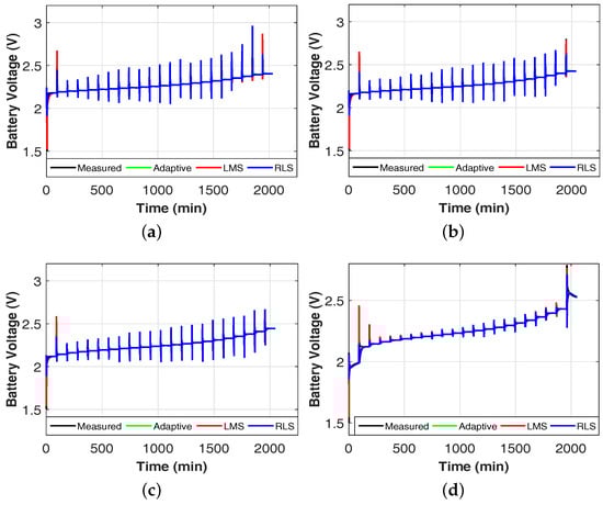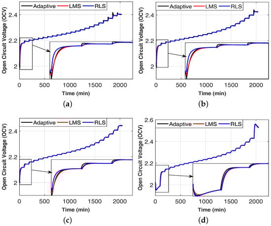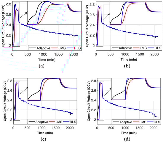 Open circuit voltage () estimation for different temperatures in charge mode. (a) 0 C; (b) 10 C; (c) 25 C; and (d) 40 C. : least mean square; and : recursive least square.
