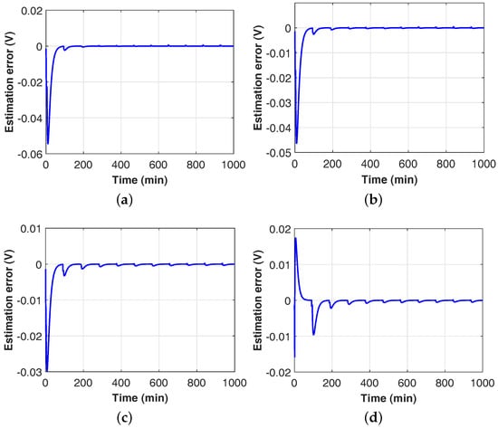 Open-circuit voltage estimation for different temperatures in discharge mode. (a) 0 C; (b) 10 C; (c) 25 C; and (d) 40 C.