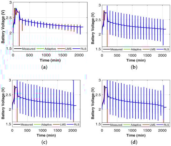 This paper presents a comparative study of different online  estimation techniques for lithium-ion batteries. Here, two adaptive filtering methods— namely, least mean square () and recursive least square ()—are designed and implemented. Moreover, an adaptive observer is also implemented for comparison purposes. It is important to note that all compared estimation strategies do not require any prior knowledge of the battery’s parameters. Numerous comparative studies have been presented for  estimation [,,,,,,,,,]. While few studies investigate the impact of different battery circuit models on the  estimation [,,], others focus on the comparison of different estimation algorithms [,,,,,,]. Among these, comparison of different kinds of Kalman filters, such as UKF, EKF, and AEKF, is popular [,,]. However, the aforementioned comparative studies either use constant charge/discharge currents or do not consider the impact of temperature on the estimation. Temperature variations are known to introduce a drift in the battery’s parameters, which reduces the estimation accuracy. Unlike these studies, the proposed comparative analysis considers both temperature variations and highly nonlinear time-varying charge/discharge current profiles for validation. Design and implementation details of all three estimation algorithms are provided. Experimental results show the accuracy and convergence properties of all estimation methods. The rest of the paper is organized as follows. Section 2 depicts the lithium-ion battery circuit model along with its system dynamics. The proposed strategy of online parameter estimation is detailed in Section 3. Experimental results are reported and discussed in Section 4. A conclusion is drawn based on these results, and future studies in this field are suggested.