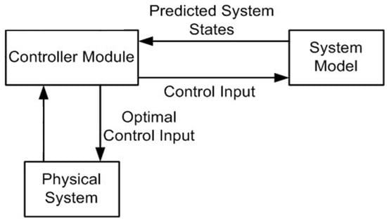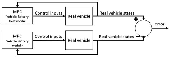To reduce fuel consumption, greenhouse gasses (GHG) emission or to improve battery lifetime, advanced power management strategies have been studied [1,2]. To achieve these goals, different off-line and real-time optimal control approaches are being developed. Model predictive control (MPC, see Figure 1 [3]) is a promising example. MPC is an advanced control methodology that was originally used in the process industries for power plants and oil refineries since the 1980s [4,5]. MPC is capable of predicting future events, in a finite-horizon, and is able to take controlled actions to optimize a cost function. Proportional, integrator, and derivative (PID) and linear quadratic regulator (LQR) controllers do not have this predictive ability. However, the prediction of MPC is usually computed for a relatively short time horizon in the future due to its computational cost. In recent years, MPC has been used for hybrid electric vehicle (HEV) and plug-in HEV (PHEV) applications, as shown in the comprehensive survey of power management topics [6]. In [6], dynamic programming-based strategies are introduced as the most conventional off-line approaches while MPC-based algorithms, and equivalent fuel consumption minimization strategy (ECMS)-based [7,8,9] are defined as the primary on-line methods. The former has been of interest in many works. For example, using a MPC, an overall power efficiency is maximized, instead of fuel consumption minimization, for a series HEV [10]. In [11], based on the price of gas and electricity in the United States, a MPC minimizes the cost of the vehicle’s energy use for a series PHEV. In another research report, engine transient characteristic is incorporated in a MPC for parallel HEV [12]. In other publications [13,14], the goal of MPC is to reduce the CO2 emissions. To implement a fast MPC, the authors in [14] proposed to compute the entire control law off-line. A global optimization-based MPC is developed, and experimental validation is provided on the test bench in [15]. Stochastic MPC with learning is proposed and validated by simulation in [16]. The MPC-based control strategy is also applied to solve the energy management problem of a series [9,17] and power-split HEVs in [18] and to analyze the potential benefits of integrating ultracapacitors (UC) in the energy storage system (ESS) unit of a power-split HEV in [19,20,21,22]. Using the Pontryagin’s minimum principle (PMP), the MPC of fuel cell hybrid vehicles (FCHVs) optimizes battery lifetime while reducing battery energy loss, fuel consumption, and powertrain cost in [23,24].