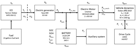 Series hybrid electric vehicle (HEV) block diagram of the Subaru BRZ 2015. ICE: internal combustion engine; SoC: state of charge; SOH: state of health; LFP: lithium iron phosphate (LiFePO4); UDDS: urban dynamometer driving schedule; and HWFET: highway fuel economy test.