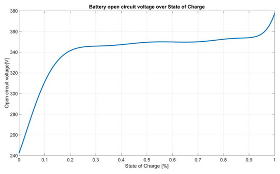 The open circuit voltage of the battery, VOC, is an eight-order polynomial equation varying over state of charge (SoC) representing the SoC–VOC curve shown in Figure 5. The data and polynomial order are extracted from [34].