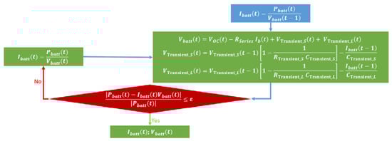Here, it is noted that Ibatt(t) is computed by using Vbatt(t − 1) whereas, in theory, Vbatt(t) is necessary. It is carried out this way because, at this stage, Vbatt(t) is unknown. The error induced by this approximation should be small considering that the voltage fluctuates slowly. However, this error exists and a simple recursive algorithmic method has been developed to minimize it. Indeed, once Vbatt(t) is computed by Equations (4)–(6), it is possible to recompute the value of Ibatt(t) using Equation (3) by replacing Vbatt(t − 1) with Vbatt(t). Then, a new value of Vbatt(t) is also recomputed using Equation (4)–(6) again. Then, the same set of instructions can be repeated as many times as desired. The purpose of this algorithm is to reduce the error due to the approximation implied by Equation (3). This recursive algorithm only stops when with ε a value as small as wanted. Figure 6 summarizes the current and voltage computation recursive algorithm.
