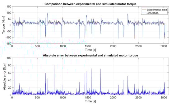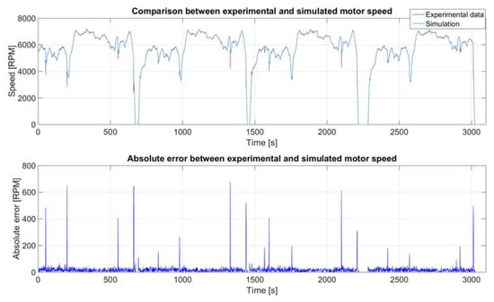 The goal of those preliminary results is to check the accuracy of the vehicle dynamics and electric motor models, described in Appendix. In fact, a poor design would prevent the evaluation of the performance of the high-fidelity battery model. However, results in Figure 8 and Figure 9 show high accuracy of the vehicle dynamics and motor models with a low average absolute error for the motor speed and good precision for the motor torque (see Table 3).