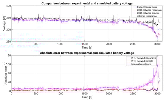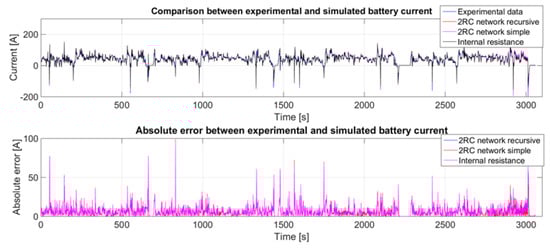 The results of those experiments show that the recursive algorithm does not bring any additional precision to the battery model compared to the two RC network battery model by itself. Nevertheless, they do prove that the two RC network battery model improves the accuracy of the estimation of the voltage and SoC of the battery, as shown in Figure 10 and Figure 11 and Table 4 and Table 5, compared to the simple internal resistance battery model. However, the impact of the battery model on the current is minimal, as shown in Figure 12 and Table 6. Those observations have a theoretical explanation. We know that Ibatt = Pbatt/Vbatt. As Vbatt fluctuations are small compared to Pbatt, Ibatt mainly depends on Pbatt. In a high-level abstraction, we could say that Ibatt = f(Pbatt) as Vbatt is quite constant. This is why precision of the battery model will not have much effect on Ibatt. We can also deduce that error on Ibatt mainly depends on the vehicle dynamics and electric motor models because Pbatt clearly depends on those equations (see Equations (1), (2) and (A1)–(A16)). However, the precision of the battery model will have an impact on Vbatt. Indeed, this battery model is made to simulate the battery response voltage due to current changes. This is why Vbatt is influenced by the model. Concerning the SoC, it is computed by integrating Ibatt. Even if the battery model has a locally small impact on Ibatt, there is a difference between both calculated currents (see Table 5). By integrating those differences, the error, regarding the SoC estimation, accumulates. This explains why the SoC of the two RC network and the internal resistance battery model are slowly diverging from each other while discharging, as shown in Figure 12.