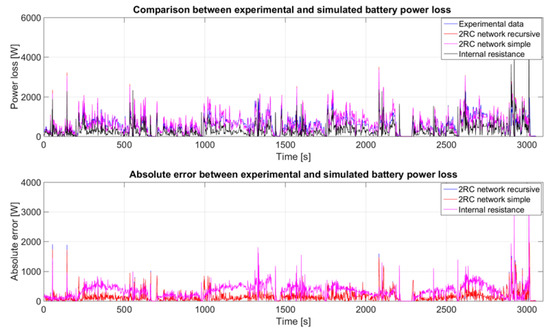 For experimental data, VOC has not been measured during the test. However, as the VOC used with the two RC Network battery model is originally derived from experimental data (see Figure 5), the same VOC has been used for computing the battery loss in experimental data. The results, shown in Figure 13 and Figure 14 and Table 7, prove that the simulated losses from the two RC Network battery model are closer to reality than the one simulated by the internal resistance battery model. This observation suggests that the improvement of the battery accuracy may impact the MPC controller. Indeed, as the simulated battery power loss is closer to reality, the power requested to the engine will change and be closer to the real need of the vehicle. Besides, it is noted that the two RC network battery model estimates the bus voltage better. Therefore, when this model is used for the battery in the power-train model of a MPC algorithm, the variables such as voltage, current, torque, and speed of other components, such as engine, generator, and traction motor, will change. Thus, it can be predicted that, in a power-train model of a MPC where a two RC network battery model is deployed, a better estimation of actual variables of the system can be accomplished.