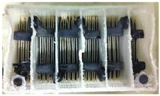 - The top cover of the battery was sawn off, and electrodes were retrieved out of each cell chamber as shown in Figure 2a,b.