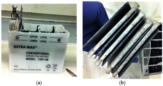 (a) A 12 V VRLA battery showing extraction of one of the six cells’ contents; and (b) The multi-electrode assembly with Absorbed Glass Matt separator.