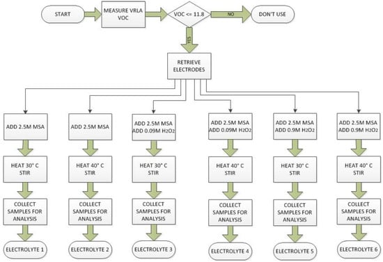 Lead recovery plan for electrolyte preparation. The electrodes retrieved from a spent VRLA battery with open circuit voltage less than 11.8 V were each placed in a beaker. An amount of 2.5 mol·dm−³ MSA was added to the electrodes. The contents were heated at either 30 °C or 40 °C. In the first two cases, no H2O2 was added, in the next two cases 0.09 mol·dm−³ H2O2 was added to the beaker while the last two had 0.90 mol·dm−³ H2O2.