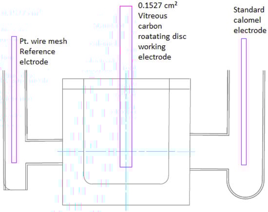 Sketch of three-electrode cell for cyclic voltammetry with 1.2 cm² Pt wire mesh reference electrode, 0.1527 cm² vitreous carbon rotating disc working electrode and a saturated calomel standard electrode.