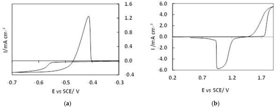 Cyclic voltammetry results of recovered electrolyte: 1 mol·dm−³ MSA using a vitreous carbon rotating disk working electrode (WE), rotated at 800 rpm, with a Pt wire reference electrode (RF) and standard calomel electrode (SCE), where a potential sweep was applied at 25 mV·s−¹, at room temperature. (a) For the Pb/Pb²+ couple, the potential was swept between −0.7 V and −0.2 V. (b) For the PbO2/Pb²+, the potential was swept between 0.2 V and 1.9 V.
