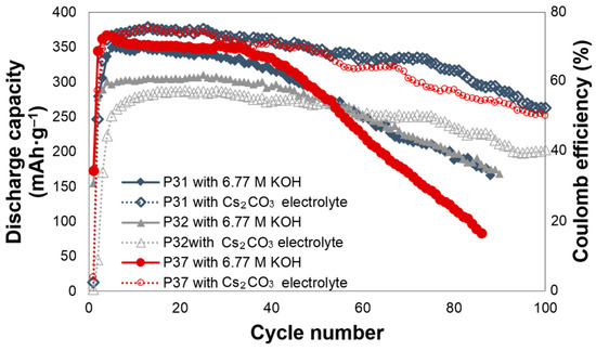The effects of Cs2CO3 addition on the electrochemical performances of alloys P31, P32, and P37 are shown in Figure 1. All of the cells require approximately three to five cycles to be activated. For alloy P31, Cs2CO3 slightly increases the initial discharge capacity, and greatly decreases the degradation. The initial discharge capacities of alloy P31 in the 6.77 M KOH and 6.44 M KOH + 0.33 M Cs2CO3 electrolytes are 349 and 375 mAh·g‒1, respectively. In the 6.77 M KOH electrolyte, the capacity of alloy P31 begins to fade after the 20th cycle, while the capacity fade begins at the 55th cycle in the 6.44 M KOH + 0.33 M Cs2CO3 electrolyte. The same trend was observed in alloy P37, where the addition of Cs2CO3 increases the initial discharge capacity from 364 mAh·g‒1 to 375 mAh·g‒1, and changes the beginning of the capacity fade from the 30th to the 65th cycle. For alloy P32, Cs2CO3 does not increase the initial discharge capacity; however, it greatly decreases the decay, as shown in Figure 1. In comparison to alloy P32, both alloys P31 and P37 contain Al, raising the possibility that the presence of Al results in the alloy surface reacting with the CO32− ions in the electrolyte and forming Al2(CO3)3. Al2(CO3)3, which is known to be unstable in water [59]. Such phenomenon may assist in the dissolution of Al into the highly alkaline electrolyte, and therefore increase the reactive surface area.