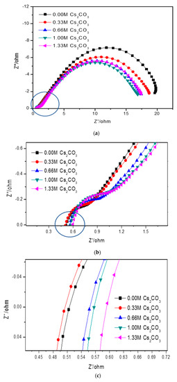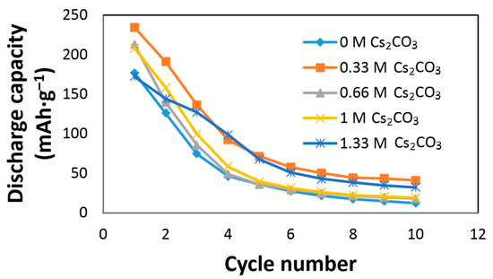 Results obtained from the current study indicate that the addition of Cs2CO3 alters the chemical and physical properties of the KOH electrolyte. As shown in Figure 6 and Table 7, an addition of 0.33 M Cs2CO3 decreases the solution resistance. Even if the electrolyte concentration was fixed at 6.77 M, the number of conductive ions increased with the addition of Cs2CO3. Therefore, the 6.44 M KOH + 0.33 M Cs2CO3 electrolyte has a decreased resistance and increased conductivity. While a low Cs2CO3 concentration promotes proton transfer in the system and improves both the discharge capacity and cycling performance, a higher Cs2CO3 concentration increases the solution resistivity due to the increased concentrations of larger cations (Cs+) and anions (CO32−) in the electrolyte, according to Stokes’ Law [12].