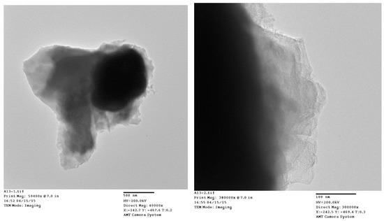 Transmission electron microscopy (TEM) micrographs at (a) ×40,400 and (b) ×300,000 magnification of AR3 cycled in the 6.44 M KOH + 0.33 M Cs2CO3 electrolyte.