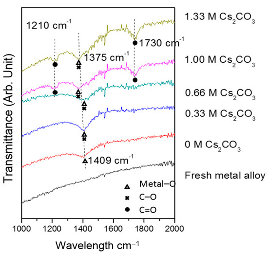 TEM micrographs of the cycled AR3 indicate that a thin layer of fluffy material covers the surface of the MH alloy (Figure 3a,b). FTIR was used to characterize the surface structure, and the results are shown in Figure 4. For the fresh MH alloy, there is no clear diffraction peak, which indicates that the alloy surface is clean. For the alloy cycled in the 6.77 M KOH electrolyte, a peak at approximately 1409 cm‒1 is observed, which is related to the vibration of surface metal–O bonds [60]. For the electrode cycled in the 6.44 M KOH + 0.33 M Cs2CO3 electrolyte, the same peak is seen, but shifted slightly to a lower wavelength, implying a decrease in bond strength. However, the peak intensity increases, which suggests the appearance of C–O bonds on the alloy surface, since the stretching vibration of the C–O bond occurs at approximately the same wavelength [61] as the metal–O bond. With further increases in concentration of Cs2CO3 in the electrolyte, the metal–O bond becomes weaker with the peak shifting even lower, to around 1375 cm‒1, and the amount of C–O bond decreases, as shown by a reduction in peak intensity compared with the electrode cycled in the 6.77 M KOH electrolyte. Moreover, peaks at approximately 1730 and 1210 cm‒1 start to appear as the content of Cs2CO3 increases, which is related to the vibration of the C=O bond in carbonate [61]. FTIR results demonstrate the changes in the surface groups on the MH alloy surface with varying Cs2CO3 concentration.